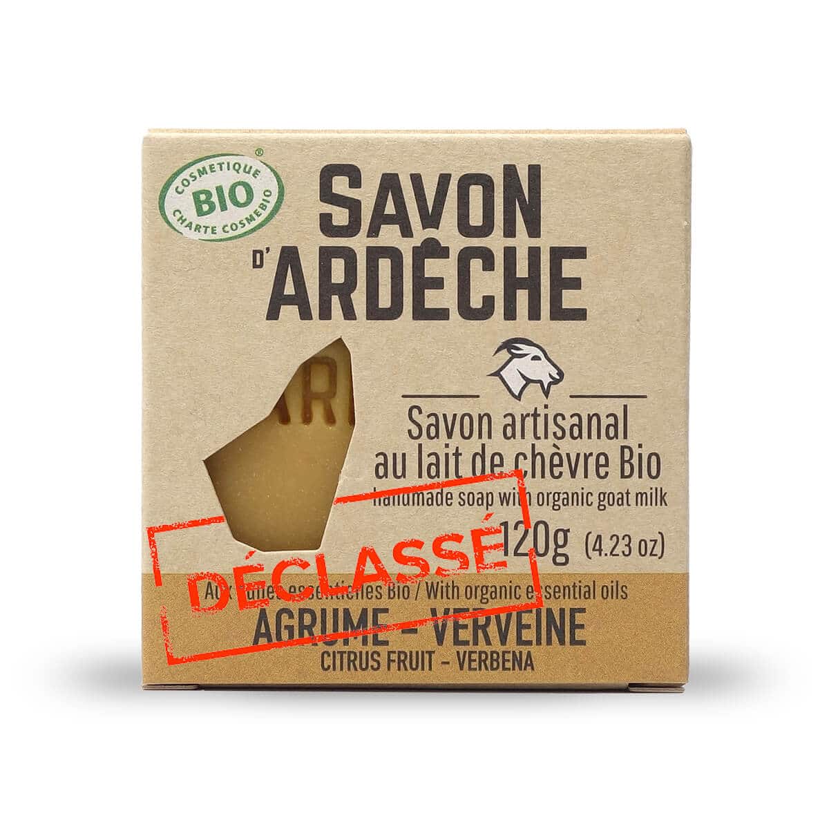 Caractéristiques particulières : Savon carré estampillé « Savon d’Ardèche » avec une tête de chèvre
