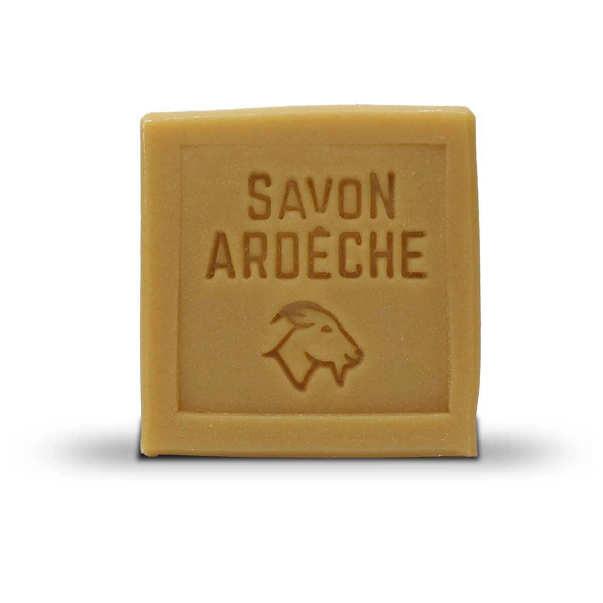 Caractéristiques particulières : Savon carré estampillé « Savon d’Ardèche » avec une tête de chèvre