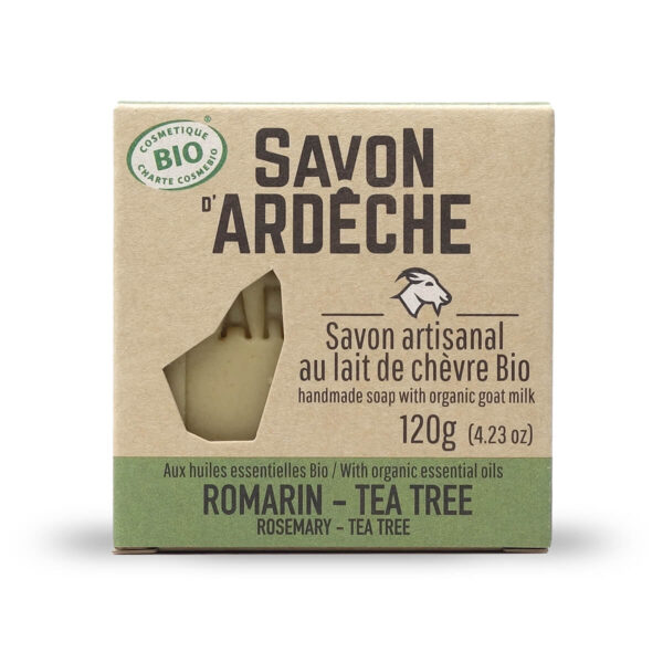 Ce savon est composé d’huiles essentielles de Romarin et de Tea Tree qui sont toutes deux des incontournables de l’aromathérapie.